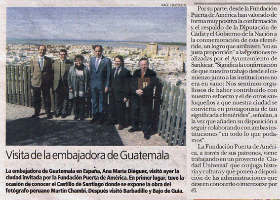 El pasado viernes, 24 de febrero la Fundación Puerta de América de Sanlúcar de Barrameda, de la que forma parte la Fundación Aguilar y Eslava de Cabra, recibía en el Patio de Armas del Castillo de Santiago, a la Embajadora de Guatemala, Ana María Diéguez. Después del acto protocolario de recepción, la comitiva guatemalteca conocería los detalles más sobresalientes de la ciudad especialmente su patrimonio cultural, artístico e histórico.
