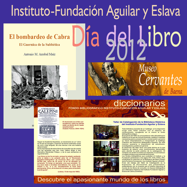 actualidad 18.04.12 Actividades en la celebración del Día del Libro Con motivo de la celebración del Día del Libro el Instituto y la Fundación Aguilar y Eslava tienen previsto realizar la presentación del libro “El bombardeo de Cabra” de Antonio Arrabal Maíz; la exposición “Diccionarios: Fondo Bibliográfico Instituto-Fundación Aguilar y Eslava” con la entrega de certificados y diplomas a los participantes en el Taller de Catalogación de la Biblioteca Histórica del Instituto-Fundación Aguilar y Eslava”; así como la participación del IES “Aguilar y Eslava” en los Premios “Quijote” patrocinados por el Museo Cervantes de Baena.