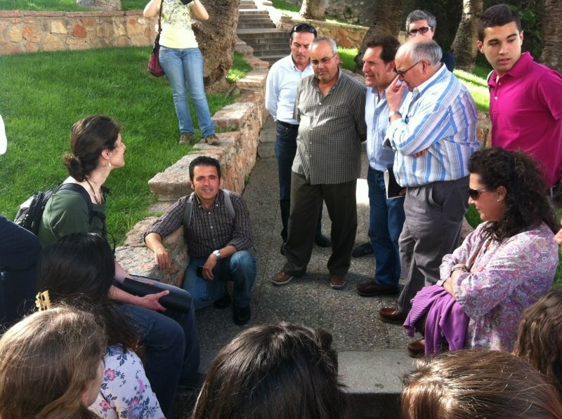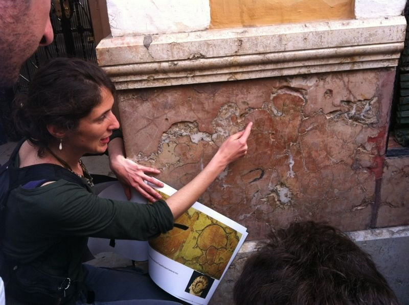 La ruta "Tras los seres petrificados de la ciudad de Cabra" comenzó en la Plaza de España donde se dio una explicación general sobre en qué consitiría la actividad. A continuación se visitó la Parroquia Mayor de la Asunción y Ángeles y sus alrederores donde Baldomero Moreno, Director del Geoparque Sierras Subbéticas y Alicia Serna, Técnico y Geóloga, dieron pautas para reconocer rocas como las calizas nodulosas, que comunmente se denominan marmol rojo de Cabra, y observar en ellas trazas o muetras de animales fósiles como los anmonites, los belemnites, lytoceras, thalassinoides… Estos se encuentran fácilmente en las columnas y pavimentos del templo, así como en la propia Plaza y Calle Mayor formando parte de acerados y muros.