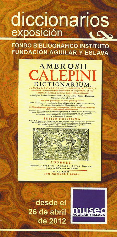 actualidad 28.05.12 Exposición de Diccionarios de los siglos XVI, XVII, XVIII y XIX en el Museo Aguilar y Eslava Cita obligada, al menos para los amantes del libro, es la visita a la Sala de Exposiciones Temporales del Museo Aguilar y Eslava, donde se puede contemplar desde el 26 de abril de 2012 una interesante y sugestiva muestra de diccionarios perteneciente a los siglos XVI, XVII, XVIII y XIX.