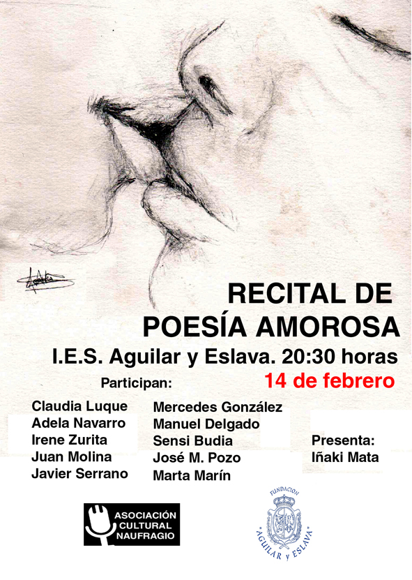 actualidad 11.02.13 Recital de poesía amorosa en el Instituto Con motivo del Día de San Valentín el jueves 14 de febrero, a las 20:30 horas, tendrá lugar en la Biblioteca del IES Aguilar y Eslava de Cabra un recital dedicado al amor a cargo de alumnos y alumnas de nuestro instituto. Presentará Iñaki Mata y participarán Manuel Delgado, Sensi Budia, José M. Pozo, Claudia Luque, Juan Molina, Mercedes González, Marta Marín, Javier Serrano, Adela Navarro e Irene Zurita.
