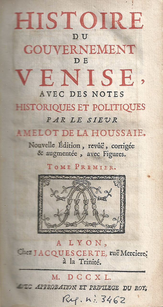 Histoire du gouvernement de Venise, avec des notes ... : tome premier / par Amelot de la Houssaie. -- Nouvelle édition, revûë, corrigée & augmentée. -- A Lyon : chez Jacques Certe, 1740