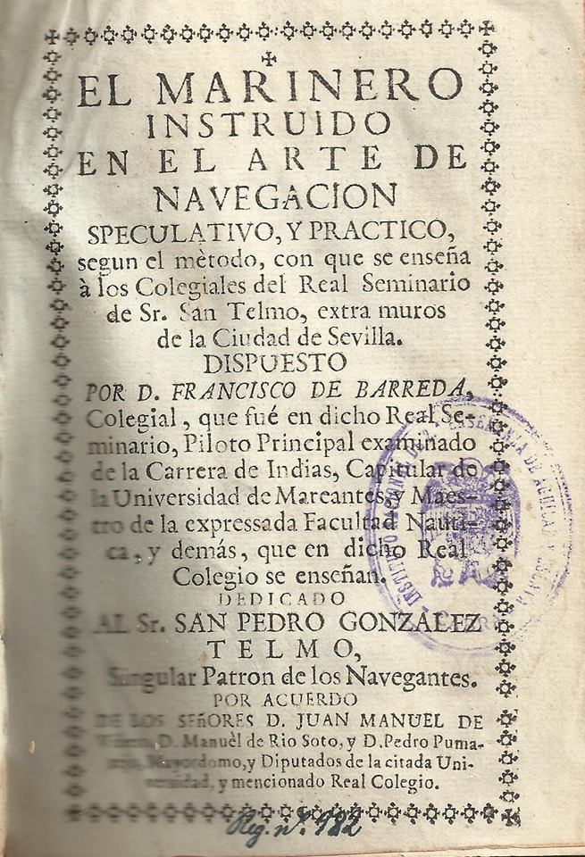 actualidad 10.12.13 LIBRO DE LA SEMANA: “El marinero instruido en el arte de navegacion especulativo y practico” (1765) El estudio de las matemáticas aplicadas a la navegación se desarrolló principalmente en las Academias de Guardias Marinas, como la de Cádiz abierta en 1717, y se continuaría en los Departamentos Marítimos de Ferrol y de Cartagena. Aunque anterior a la Academia de Cádiz, y que convivió después con ella, fue el Colegio de Pilotos de San Telmo de Sevilla y donde Francisco de Barreda fue profesor de matemáticas de su Escuela de Mareantes.