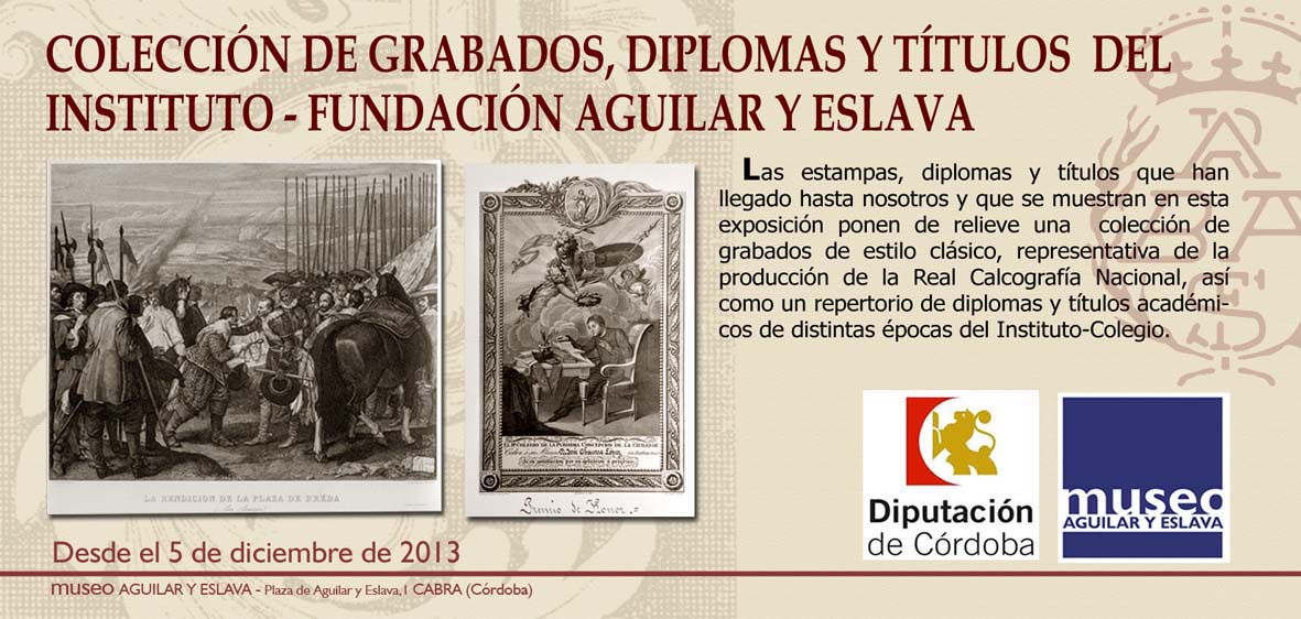actualidad 20.12.13 COLECCIÓN DE GRABADOS, DIPLOMAS Y TÍTULOS DEL INSTITUTO –FUNDACIÓN AGUILAR Y ESLAVA. Desde el 5 de diciembre se puede visitar en el Museo Aguilar y Eslava la exposición titulada COLECCIÓN DE GRABADOS, DIPLOMAS Y TÍTULOS DEL INSTITUTO –FUNDACIÓN AGUILAR Y ESLAVA. Una muestra en la que podemos volver a ver la colección de grabados de estilo clásico (siglos XVIII y XIX), así como un curioso repertorio de diplomas y títulos académicos que son documentos reveladores de las distintas épocas de Instituto-Colegio de Cabra.