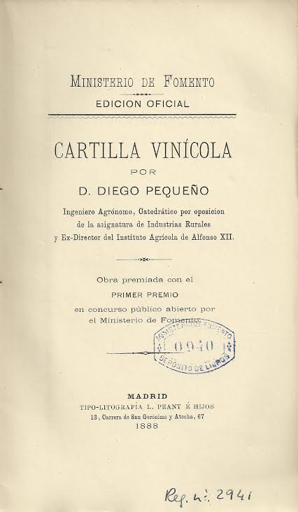 actualidad 02.01.14 LIBRO DE LA SEMANA: “Cartilla vinícola” (1888) Comenzamos en este nuevo año 2014 la sección del LIBRO DE LA SEMANA con la "Cartilla vinícola", una obra premiada con el primer premio en concurso público abierto por el Ministerio de Fomento y editada oficialmente por dicho Ministerio en 1888. Su autor Diego Pequeño fue ingeniero agrónomo, catedrático por oposición de la asignatura de Industrias Rurales y exdirector del Instituto Agrícola de Alfonso XII.