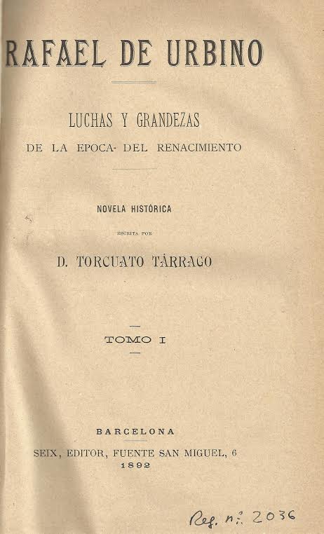 Rafael de Urbino : luchas y grandezas de la época del renacimiento : novela histórica / escrita por Torcuato Tárrago. -- Barcelona : Seix, 1892
