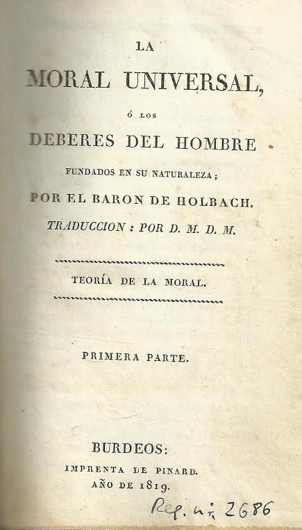 La moral universal o los Deberes del Hombre fundados en su naturaleza / por el Baron de Holbach ; traducción por D.M.D.M. -- Burdeos : [s.n.], 1819 (Imprenta de Pinard)