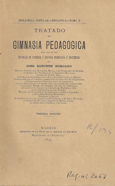 Tratado de gimnasia pedagógica para el uso de las escuelas de primera y segunda enseñanza é institutos / por José Sanchez Somoano. -- 3ª ed. -- Madrid : [s.n.], 1894 (Imprenta de la Viuda de M. Minuesa de los Rios)