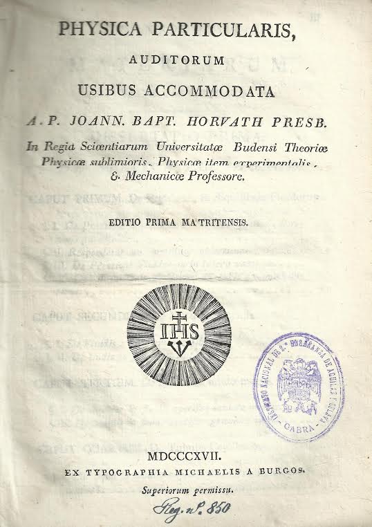 Physica particularis... / a P. Ioann. Bapt. Horvath... -- Editio prima matritensis .--[S.l. : s.n.], 1817 (ex typographia Michaelis a Burgos)