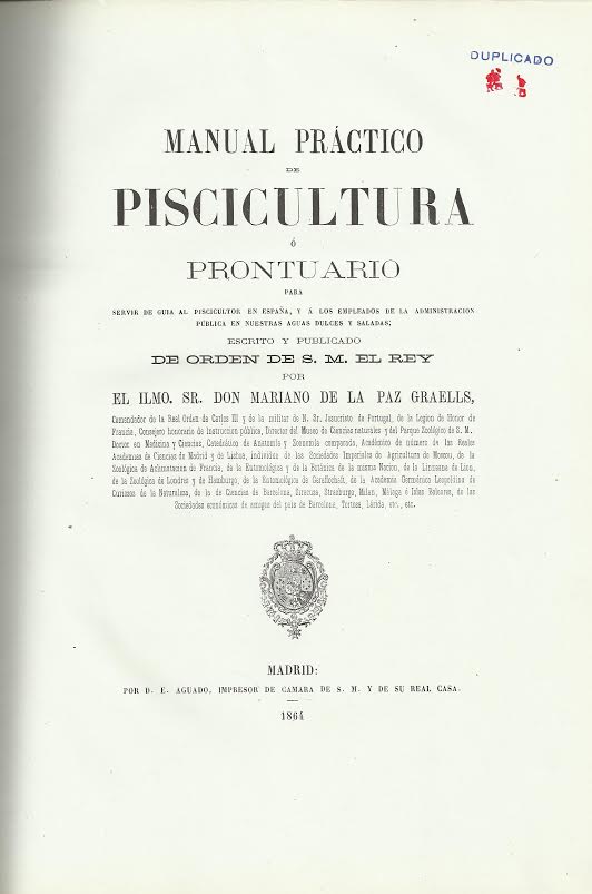 Manual práctico de piscicultura ó Prontuario para servir de guía al piscicultor en España... / escrito y publicado... por Mariano de la Paz Graells. -- Madrid : [s.n.], 1864 (por D.E. Aguado...)
