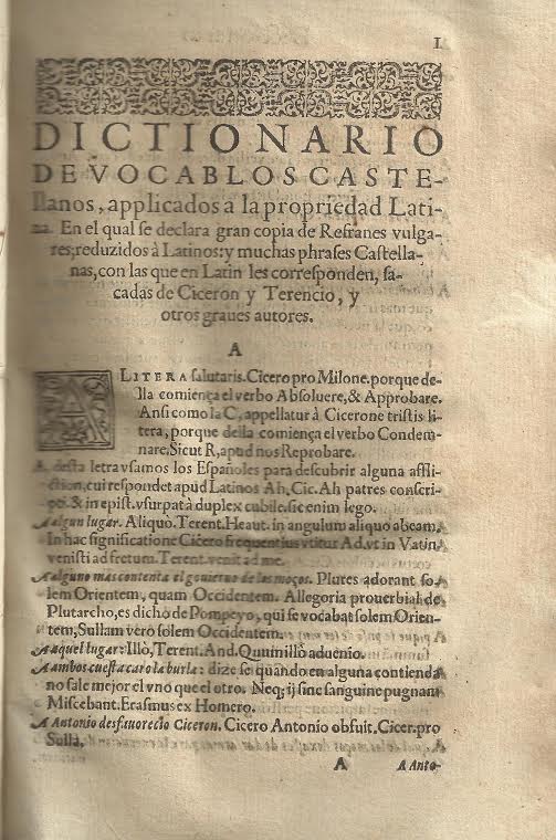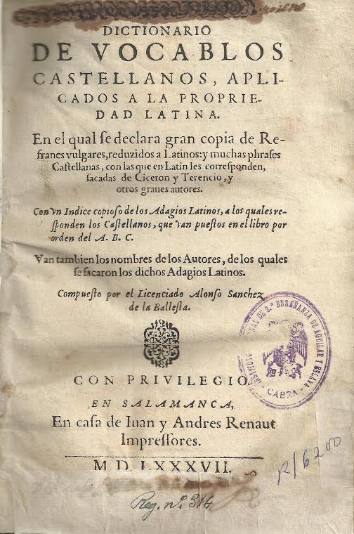 En 1587, ve la luz en Salamanca la primera y única edición del “Dictionario de vocablos castellanos aplicados a la propiedad latina” de Alonso Sánchez de la Ballesta. Se trata de un repertorio español-latino de 10.600 entradas, entre las que se encuentran numerosas formas pluriverbales, ya sean frases proverbiales, refranes o citas tomadas de autores latinos. Un ejemplar de la primera y única edición se encuentra en la Biblioteca Histórica Aguilar y Eslava.