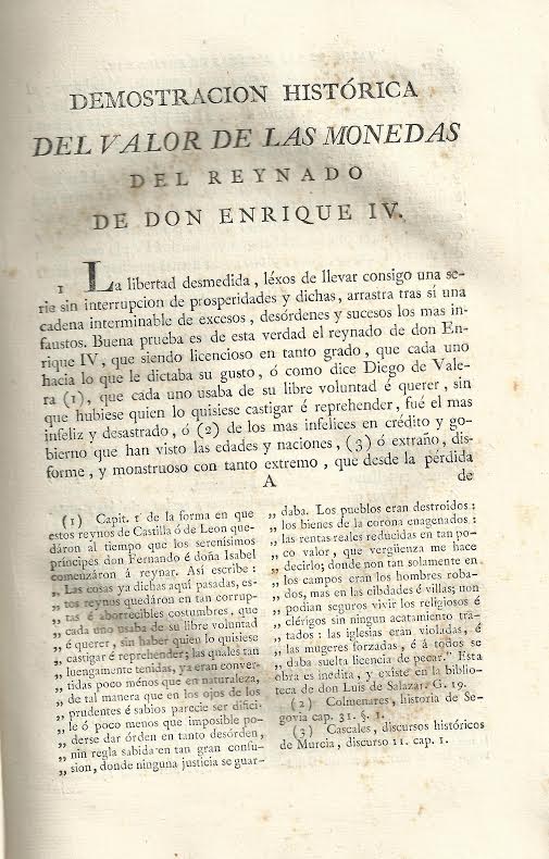 Demostración histórica del verdadero valor de todas las monedas que corrían en Castilla durante el reynado del Señor Don Enrique IV y de su correspondencia con las del Señor D. Carlos IV : con un apéndice de instrumentos que justifican el valor de las mismas ... / su autor ... Fray Liciniano Sáez, monge benedictino ... y académico de número de la Real Academia de la Historia ; publícala la misma Real Academia. -- Madrid : [s.n.], 1805 (en la Imprenta de Sancha)