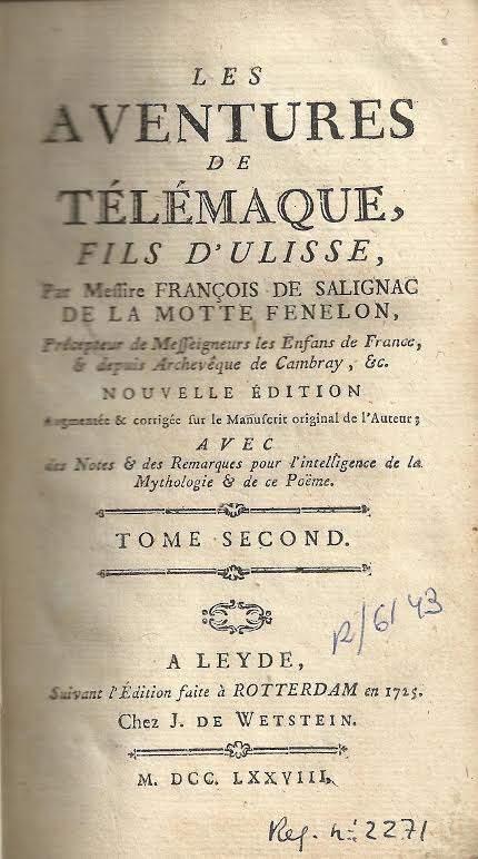 Les aventures de Télémaque, fils D'Ulisse / par Messire François de Salignac de la Mothe Fenelon ... ; tome second. -- Nouvelle édition augmentée & Corrigée sur le Manuscrit original de l'Autor. -- A Leyde suivant l'Edition faite à Rotterdam en 1725 : chez I. De Wetstein, 1778