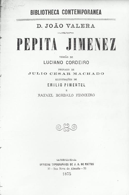 Pepita Jimenez / João Valera; versão de Luciano Cordeiro; prefacio de Julio César Machado; illustraçaos de Emilio Pimentel e Rafael Bordalo Pinheiro. -- Lisboa : [s.n.], 1875 (officina tipographica de J.A. de Mattos)