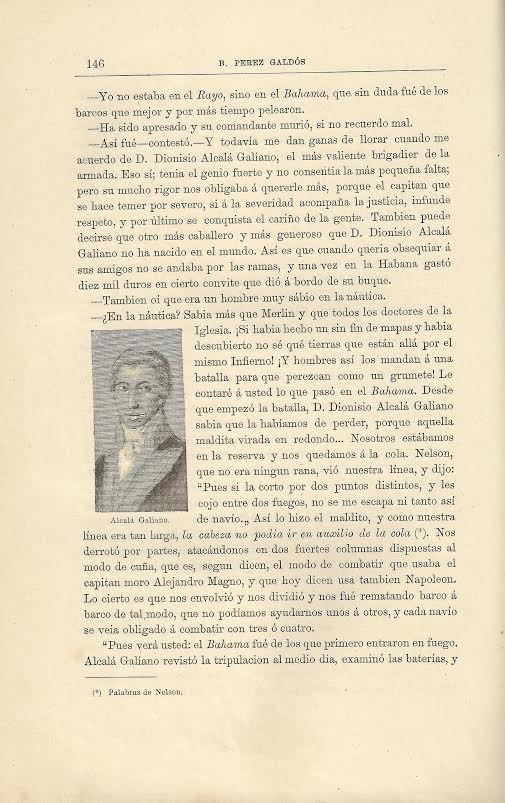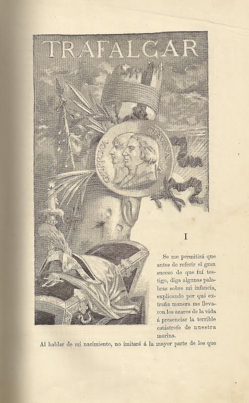 Hoy traemos a nuestro Libro de la Semana el tomo I de la colección; todos los volúmenes se encuentran en el fondo de la Biblioteca Histórica Aguilar y Eslava. Trafalgar es la primera novela de la primera serie de los Episodios Nacionales y narra la historia del joven gaditano Gabriel de Araceli, que a los 14 años se ve envuelto en la batalla de Trafalgar como criado de un viejo oficial de la Armada en la reserva. En la novela, a D. Dionisio Alcalá Galiano se le alude como “el más valiente brigadier de la armada” y “también puede decirse que otro más caballero y más generoso que D. Dionisio Alcalá Galiano no ha nacido en el mundo”.