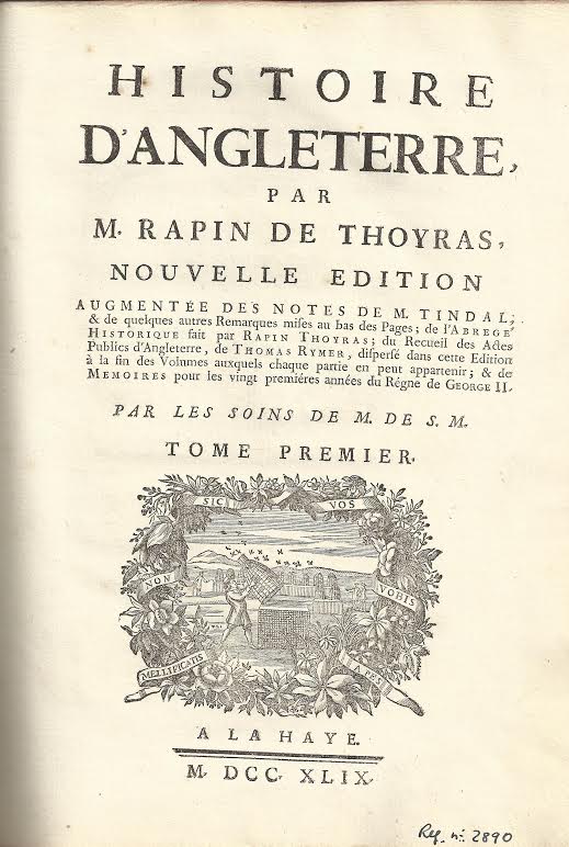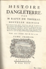 * Histoire d´Angleterre, par M. Rapin de Thoyras, nouvelle edition augmentée des notes de M. Tendal; de quelques autres Remarques mises au bas des Pages; de l´Abrege Historique fait par Rapin Thoyras; du Recueil des Actes Publics d´Angleterre, de Thomas Rymer, dispersé dans cette Edition à la fin des Volumes auxquels chaque partie en peut appartenir; de Memoires pour les vingt prmiéres années du Régne de George II. Par les soins de M. de S. M. ; A La Haye. M. DCC. XLIX.