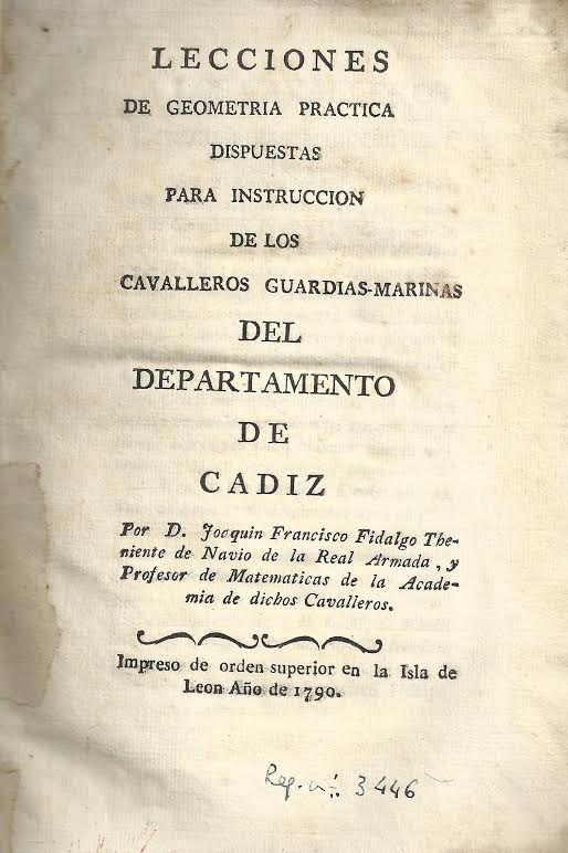 Lecciones dispuestas para la instrucción de los caballeros guardias marinas del Departamento de Cádiz. Impreso en 1790 en la isla de León, se publicó siendo Fidalgo teniente de navío de la Real Armada y profesor de matemáticas de la Academia de dichos caballeros. Este ejemplar forma parte de la Biblioteca Histórica Aguilar y Eslava. Joaquín Francisco Fidalgo (Urgel, Lérida, 1758; Sevilla, 1820) fue geógrafo y marino español, así como maestro de la Academia de guardias marinas de Cádiz. En 1791 ascendía a capitán de fragata y en 1792 capitaneó una de las dos divisiones de bergantines de la llama expedición del Atlas de la América Septentrional, destinada a trazar las cartas geográficas y derroteros entre el golfo de México, Florida, Tierra Firme y las Antillas. La otra división fue capitaneada por Cosme Damián Curruca.