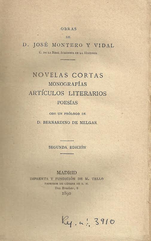 Obras de D. José Montero y Vidal : novelas cortas, monografías, artículos literarios, poesías / con un prólogo de Bernardino de Melgar. -- 2a ed. -- Madrid : [s.n.], 1890 (Imprenta y Fundición de M. Tello)