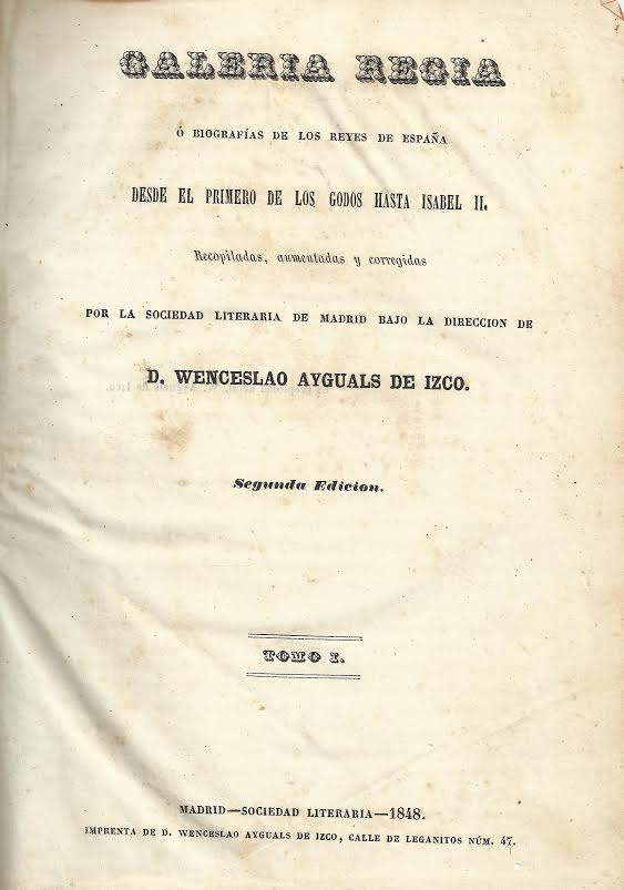Galeria regia ó Biografías de los reyes de España desde el primero de los godos hasta Isabel II / recopiladas, aumentadas y corregidas por la Sociedad literaria de Madrid bajo la dirección de Wenceslao Ayguals de Izco.-- 2ª ed.-- Madrid : Sociedad Literaria, 1848 (Imprenta de Wenceslao Ayguals de Izco)