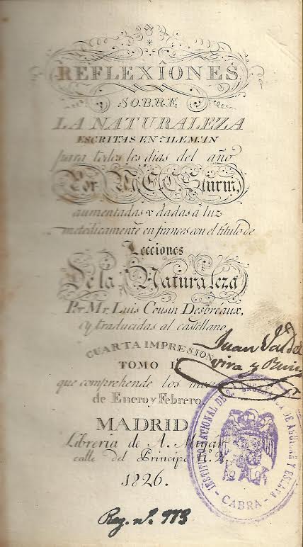 Reflexiones sobre la naturaleza / escrita en aleman para todos los dias del año por M.C.C. Sturm ; aumentadas y dadas a luz metódicamente en frances con el título de Lecciones de la naturaleza por Mr. Luis Cousin Despréaux ; y traducidas al castellano.-- 4ª imp.-- Madrid : Libreria de A. Miyár, 1826 ( Imp. de D. Miguel de Burgos)