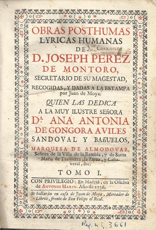 En la portada de cada uno de los tomos (I y II), se indica que Pérez de Montoro es secretario de su Majestad y son recogidas y dadas a la estampa las “Obras posthumas lyricas humanas” por Juan de Moya, quien las dedica “a la muy ilustre señora D.ª Ana Antonia de Góngora Avilés Sandoval y Bañuelos, marquesa de Almodóvar, señora de la Villa de la Rambla, y de Santa María de Trassierra, la Zarza, y Cañaveral”. En dicha portada (a dos tintas), cuyo texto está enmarcado en una doble cenefa, aparece una firma manuscrita: “Lcdo. Carrasco”, en el primer tomo, y “Lcdo. Carrasco y Palomino”, en el segundo. Desconocemos la autoría, pero hemos de señalar que los dos volúmenes (encuadernados en pergamino) forman parte de la donación que don Juan Valera hizo al Colegio-Instituto de Cabra en 1875.