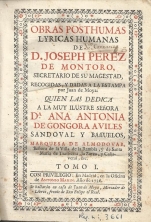 Obras posthumas lyricas humanas / de D. Joseph Perez de Montoro ... ; recogidas y dadas a la estampa por Juan de Moya ... ; tomo I y tomo II.-- En Madrid : en la oficina de Antonio Marin : se hallarán en casa de Juan de Moya ..., 1736.