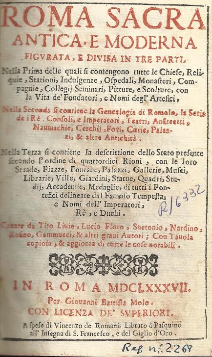 Roma sacra antica e moderna figurata, e divisa in tre parti : nella prima delle quali si contengono tutte le Chiese, reliquie, stationi ... ; nella seconda si contiene la genealogia di Romolo, la sere de i Rè, Consoli ... ; nella terza si contiene la descrittione dello stato presente secondo l’ordine di quattordici Rioni ... / cauare da Tito Liuio, Lucio Floro, Suetonio, Nardino, Rosino, Gammucci, altri graui autori … -- In Roma : per Giouanni Battista Molo : a spese di Vicenzo de Romanis ..., 1687