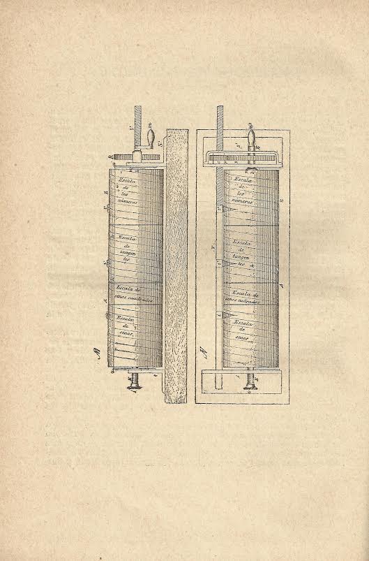 La “Hélice logarítmica” la describe como una maquinaria auxiliar de cálculo que lleva las escalas logarítmicas arrolladas en hélice, disposición que permite agrandar convenientemente los espacios entre los trazos divisorios y obtener en pequeño volumen escalas de gran longitud en su desarrollo, facilitándose además las lecturas por situar de una vez para todas la generatriz que ha de servir de línea de fe en la posición más ventajosa, para que se halle bien iluminada, presente la numeración al observador siempre en posición directa y sustituyendo el movimiento de deslizamiento por el de rotación, mucho más suave en esta clase de aparatos manuables.