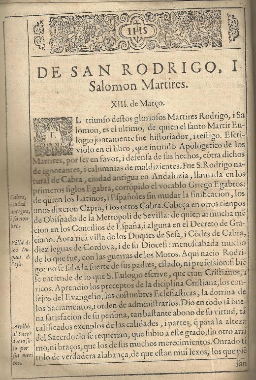 Con respecto a los mártires egabrenses, San Rodrigo aparece junto a Salomón, el 13 de marzo, remitiéndonos el autor al Apologético de los Mártires de San Eulogio, fuente lógica y principal de lo que relata Martín de Roa en su estudio (María Jesús Aldana García publicó en 1998, Universidad de Córdoba, la traducción completa de las obras en latín de S. Eulogio, con numerosas notas y extraordinaria introducción). Las apostillas marginales en las páginas ayudan a seguir la historia del mártir egabrense: “Cabra, ciudad antigua y su nombre”; “Villa de los duques de Sesa”, etc. (hojas 41 a 48).
