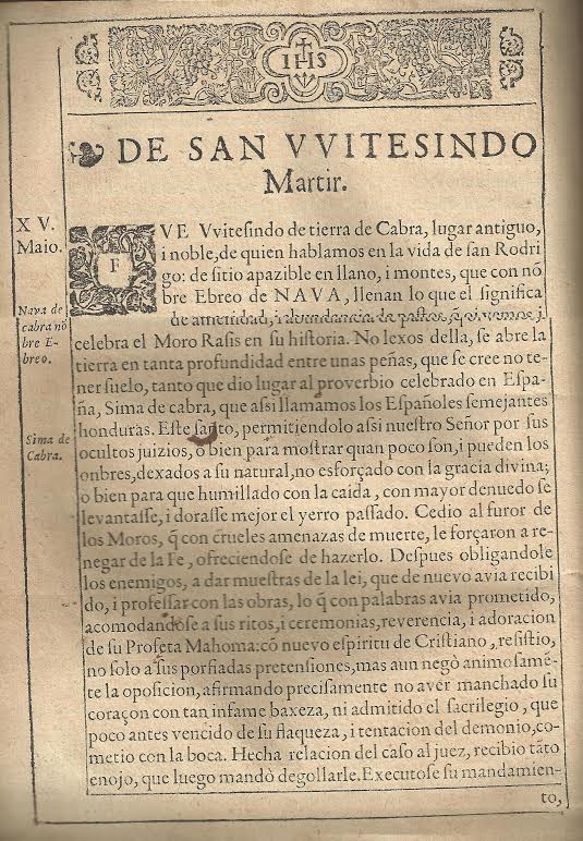 El 15 de mayo sitúa la festividad de San Witesindo, “de tierra de Cabra, lugar antiguo y noble”. Dos páginas ocupan su corta biografía, ampliada en Martín de Roa con respecto a S. Eulogio al hablarnos de la Nava (alude a la historia del moro Rasis) y también ocupándose de la sima de Cabra: “No lejos de ella [se refiere a la Nava], se abre la tierra en tanta profundidad entre unas peñas, que se cree no tener suelo, tanto que dio lugar al proverbio celebrado en España, sima de Cabra, que así llamamos los españoles semejantes honduras”.