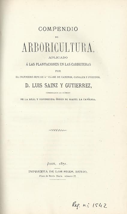 Compendio de arboricultura : aplicado á las plantaciones en las carreteras / por Luis Sainz y Gutierrez.-- Jaen : [s.n.], 1871 (Imprenta de los Sres. Rubio)