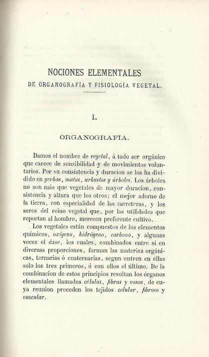 La primera parte comprende unas nociones elementales de organografía, en la que se habla de los órganos de la nutrición y de la reproducción, exponiéndose ideas de la fisiología vegetal: germinación, absorción, respiración, circulación, nutrición y crecimiento, secreciones y excreciones, florescencia, fecundación fructificación, diseminación, crecimiento de las raíces y muerte de los árboles.