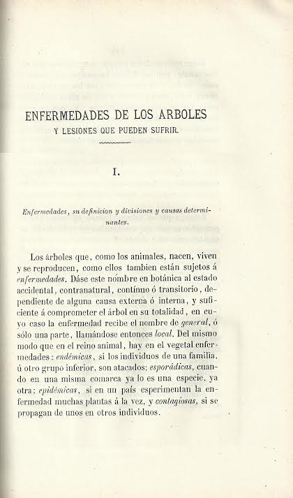 La séptima parte, las enfermedades de los árboles y las lesiones que pueden sufrir: divisiones de las primeras y causas determinantes, enfermedades que tienen su origen en un exceso de fuerza vegetativa, general o particular, enfermedades que reconocen por causa un defecto de fuerza vegetativa, lesiones físicas.