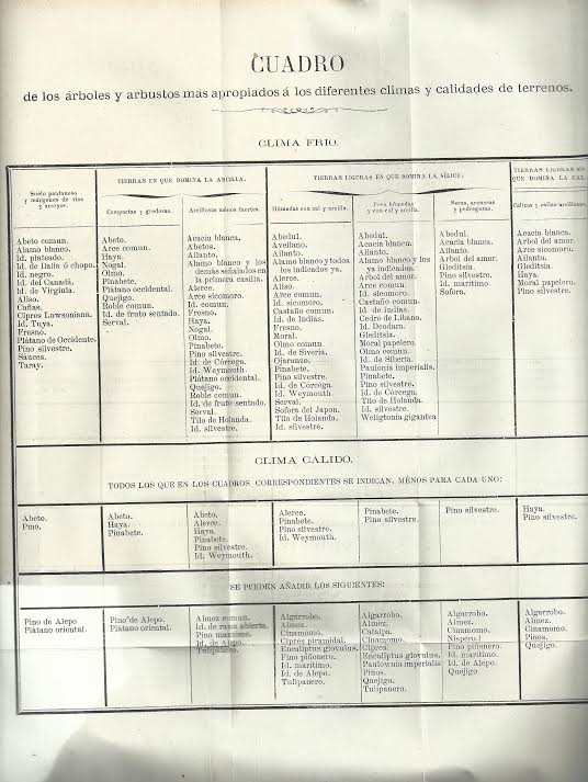 La cuarta parte, el trasplante definitivo: elección de especies según el clima y calidad del terreno, apertura de hoyas, sus dimensiones y distancias, estación más oportuna para el desplante y modo de ejecutarle, trasplante en general y de árboles grandes, riegos y defensas.