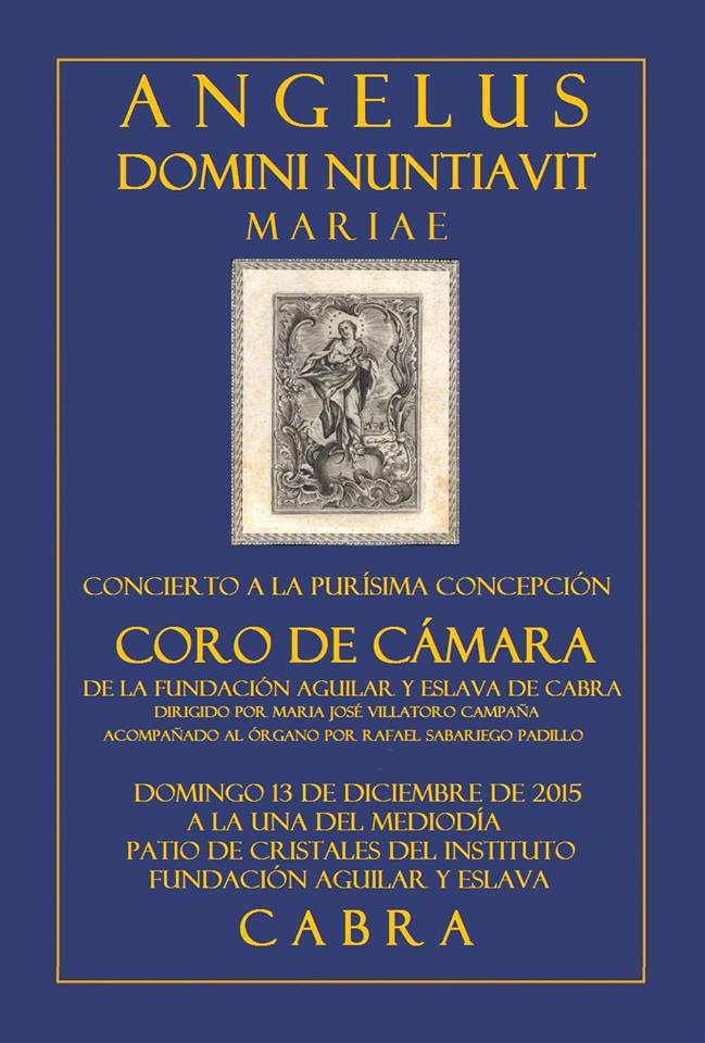 actualidad 16.12.15 Concierto del Coro de Cámara Fundación Aguilar y Eslava "Angelus Domini nuntiavit Mariae" dedicado a la Inmaculada El domingo día 13 de diciembre, el Coro de la Fundación "Aguilar y Eslava", celebró un concierto dedicado a la Inmaculada Concepción con la interpretación de un programa de "Avemarías" de distintas épocas y compositores, en el Patio de Cristales del histórico I.E.S. "Aguilar y Eslava", bajo la excelente y reconocida dirección de Mª José Villatoro Campaña y el acompañamiento al órgano de Rafael Sabariego Padillo.