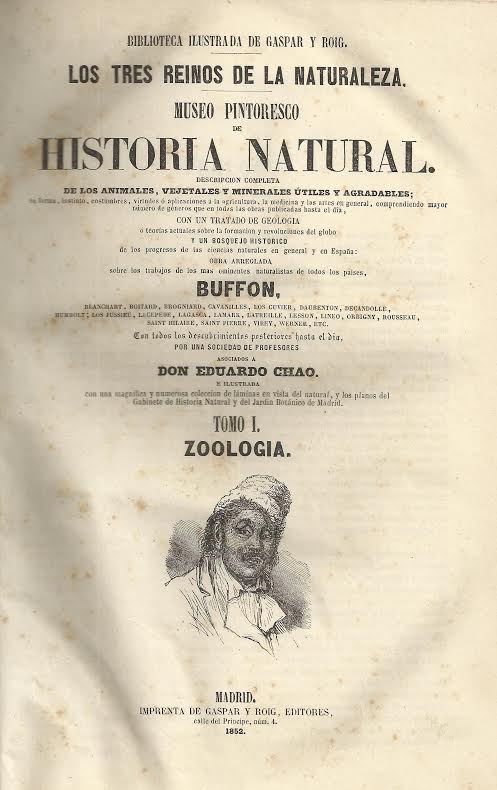 Los tres reinos de la naturaleza : museo pintoresco de historia natural : descripción completa de los animales, vegetales y minerales útiles y agradables, su forma, instinto... / obra arreglada sobre los trabajos de los mas eminentes naturalistas de todos los paises... con todos los descubrimientos posteriores hasta el dia, por una sociedad de profesores asociados a Eduardo Chao ; e ilustrada con una magnífica y numerosa colección de láminas.-- Madrid : Imprenta de Gaspar y Roig, editores, 1852-1858.