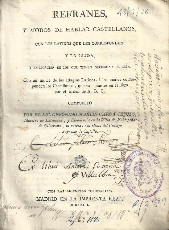 Refranes, y modos de hablar castellanos : con los latinos que les corresponden, y la glosa, y explicación de los que tienen necesidad de ella : con un indice de los adgios latinos, á los quales corresponden los castellanos, que van puestos en el libro por el órden de A.B.C. / compuesto por el lic. Gerónimo Martin Caro y Cejudo.-- Madrid : en la Imprenta Real, 1792.