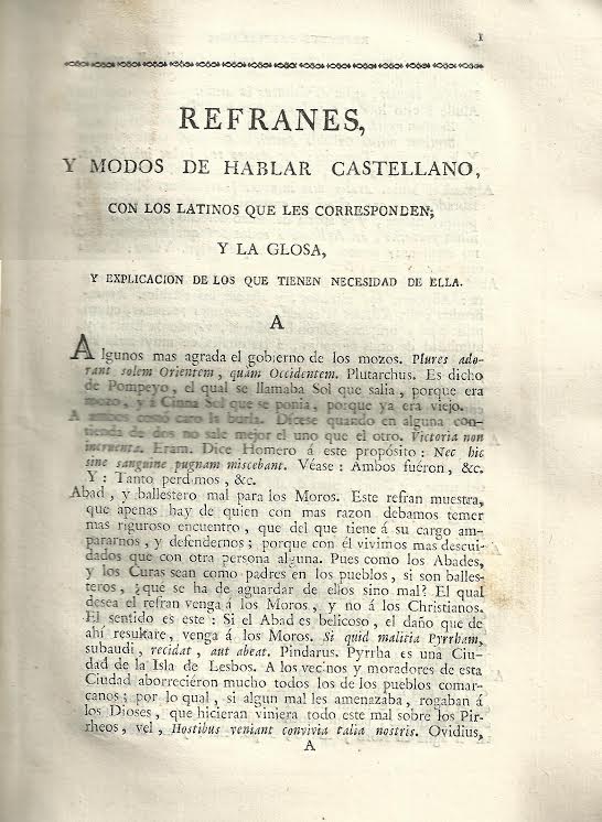 actualidad 05.01.16 LIBRO DE LA SEMANA “Refranes, modos de hablar castellano, con los latinos que les corresponden y la glosa y explicación…”, compuesto por Jerónimo Martín Caro y Cejudo (Madrid, 1792)