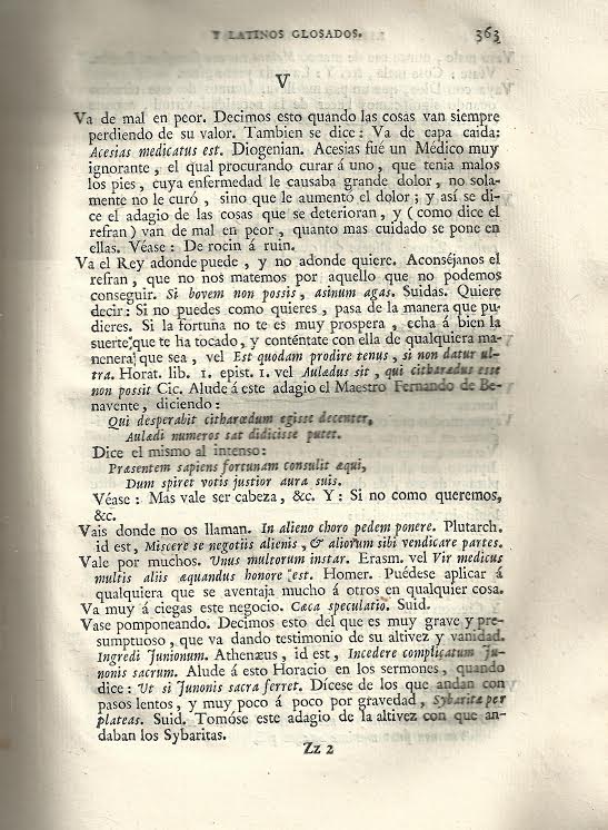 Jerónimo Martín Caro y Cejudo, maestro de latinidad y elocuencia en la villa de Valdepeñas de Calatrava, su patria, con título del Consejo Supremo de Castilla, escribió en el siglo XVII “Refranes y modos de hablar castellano con los latinos que les corresponden y la glosa y explicación de los que tienen necesidad de ella, con un índice de los adagios latinos a los cuales corresponden los castellanos que van puestos en el libro por el orden de A B C”. Fue un texto usado para el aprendizaje del latín, viendo la luz la edición príncipe en el año 1675 en el madrileño taller de Julián Izquierdo. La que traemos como Libro de la Semana es una reimpresión de 1792 llevaba a cabo en Madrid en la Imprenta Real, con una ligera variación en el título.