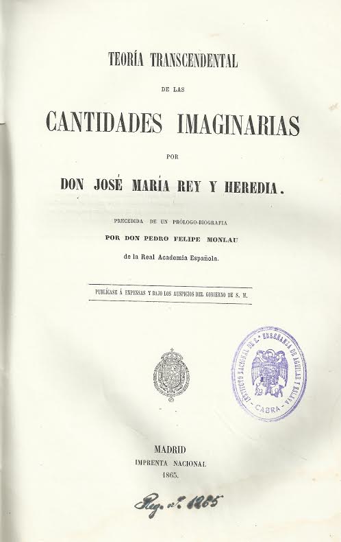 Teoría transcendental de las cantidades imaginarias / por José María Rey y Heredia ; precedida de un prólogo-biografía por Pedro Felipe Monlau.-- Madrid : Imp. Nacional, 1865.