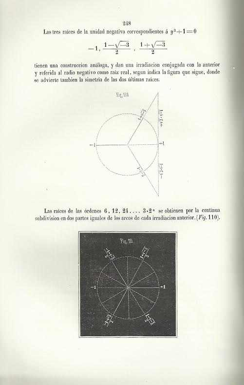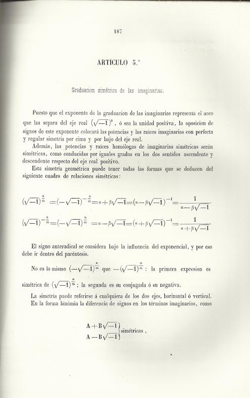 Libro I. De la naturaleza e interpretación de las cantidades imaginarias, con seis capítulos: Exposición matemática de los conceptos de la cualidad (15 artículos), De las cantidades imaginarias consideradas como raíces (8 artículos), Del módulo y argumento de las expresiones imaginarias (2 artículos), Interpretación del imaginarismo en las ecuaciones de segundo grado (2 artículos), Interpretación del imaginarismo en las secciones cónicas (5 artículos) y Resumen de este libros y transición a los siguientes.