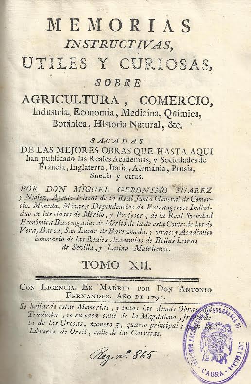 “Memorias instructivas, útiles y curiosas sobre agricultura, comercio, industria, economía, medicina, química, botánica, historia natural, etc.”, sacadas de las mejores obras por Miguel Jerónimo Suárez y Núñez (Madrid, 1791)