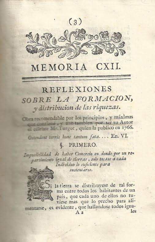 Memoria CXII. Reflexiones sobre la formación y distribución de las riquezas. Obra recomendable por los principios y máximas que contiene y aún también por ser su autor el célebre Mr. Turgot, quien la publicó en 1766.