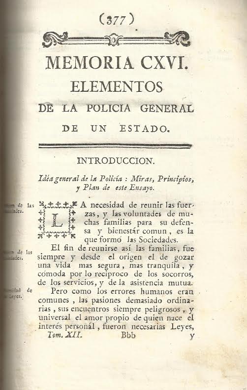 Memoria CXVI. Elementos de la policía general de un estado. Se habla del origen de las sociedades, del objeto de estas sociedades y de la necesidad de las Leyes, etc.