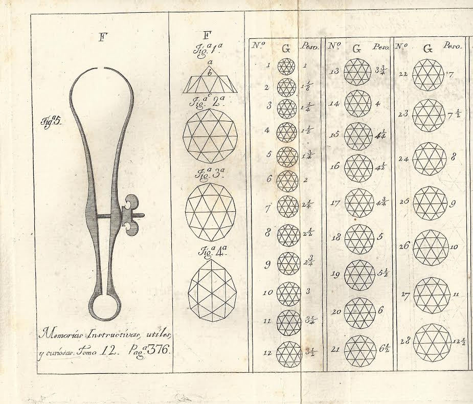 Memoria CXV. Tratado de los diamantes y de las perlas, en que después de considerar su importancia se establecen reglas ciertas para conocer su justo valor y se da el verdadero modo de tallar los diamantes. En el se hallan observaciones curiosas, igualmente útiles a los comerciantes que a los viajeros y que aun interesan a la política, por el joyero David Jefries. Un trabajo traducido del inglés al francés por la segunda edición considerablemente aumentada, y al castellano por orden de S. M. dada al traductor de estas memorias.