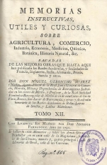 Memorias instructivas, utiles y curiosas sobre agricultura, comercio, industria, economía, medicína, química, botánica, historia natural ... : sacadas de las mejores obras que hasta aqui han publicado las Reales Academias ... por don Miguel Geronimo Suarez y Nuñez ... ; tomo XII.-- En Madrid : por D. Antonio Fernandez : se hallaran estas memorias y todas las demás obras del traductor en su casa ... y en la Libreria de Orcel,1791.