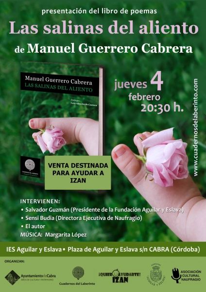 actualidad 09.02.16 Presentación en la Fundación Aguilar y Eslava del último poemario de Manuel Guerrero "Las salinas del aliento" es el último libro de poemas de Manuel Guerrero Cabrera que se presentó el jueves 4 de febrero, a las 20:30, en el IES Aguilar y Eslava de Cabra. Además del autor, intervinieron Salvador Guzmán, presidente de la Fundación Aguilar y Eslava, y Sensi Budia, directora de la Asociación Cultural Naufragio, y colaboraron con lecturas Carmen Muñoz, Carmen León, Lorena López y Beatriz González. La música estuvo a cargo de Margarita López.
