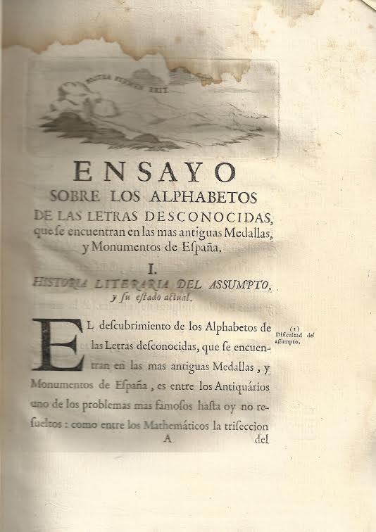 En el primer apartado, HISTORIA LITERARIA DEL ASUNTO y su estado actual, Velázquez aborda la dificultad existente, indicando que es entre los anticuarios uno de los problemas más importantes en el día. Nuestro autor reduce a tres las clases en las que se encuentran estas letras desconocidas: La primera a las medallas celtibéricas, pertenecientes la mayor parte de ellas a la provincia Tarraconense y que son las mismas que Lastanosa dio a conocer en su primera publicación y única colección hasta aquel momento. Vincencio Juan de Lastanosa (Huesca, 1607-1681) fue erudito, coleccionista, numismático, mecenas español y gentilhombre de la casa de Carlos II. La segunda a las medallas turdetanas o béticas primitivas de Obulco, Urso, Amba, Aspavia y otros pueblos antiguos de la Bética. Y la tercera a las medallas fenicias y púnicas de Gadir, Asido, Kanaka y otras ciudades fundadas o habitadas en España por los fenicios y cartagineses. Añade en esta sección lo que se ha trabajado sobre las medallas celtibéricas, los adelantos sobre las turdetanas y lo realizado sobre las fenicias y púnicas de España.