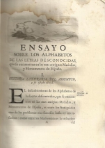 Ensayo sobre los alphabetos de las letras desconocidas : que se encuentran en las mas antiguas medallas y monumentos de España / por don Luis Joseph Velazquez ... de la Academia Real de la Historia ; escrito, revisto y publicado de Orden de la misma Academia.-- En Madrid : en la Oficina de Antonio Sanz ..., 1752.