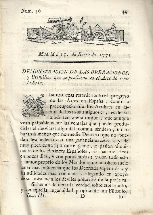 El volumen que nos ocupa recoge la descripción y noticias de las villas de Alcoy, Carrión de los Condes, Cocentaina, así como de las ciudades de Burgos, Lorca, Puerto de Santa María y Villena. Se incorporan unos textos sobre el arte de teñir las sedas y diversas reales cédulas, provisiones y providencias aparecidas en el periodo reseñado de la publicación. Las reflexiones políticas que se insertan son interesantes y novedosas. Entre ellas: sobre el beneficio que pueden recibir las artes comunicándose datos de sus trabajos y labores; sobre la grave necesidad de dar a cada oficio de España instrucción o cartilla de su profesión; sobre la utilidad a todo el Reino de unas referencias exactas y completas de agricultura y los beneficios que han sacado los extranjeros de su estudio; sobre lo mucho que pierde España en no hacer buen uso de sus cosechas; sobre el modo suave como se podrían aumentar las artes y el comercio en España, etcétera.
